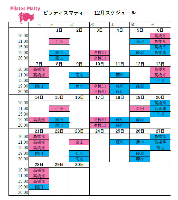 しかし12月は平日夜と土日の午前の予約受付時間を増やし、多くのお客様が継続的にピラティスを実施していただければ幸いです。